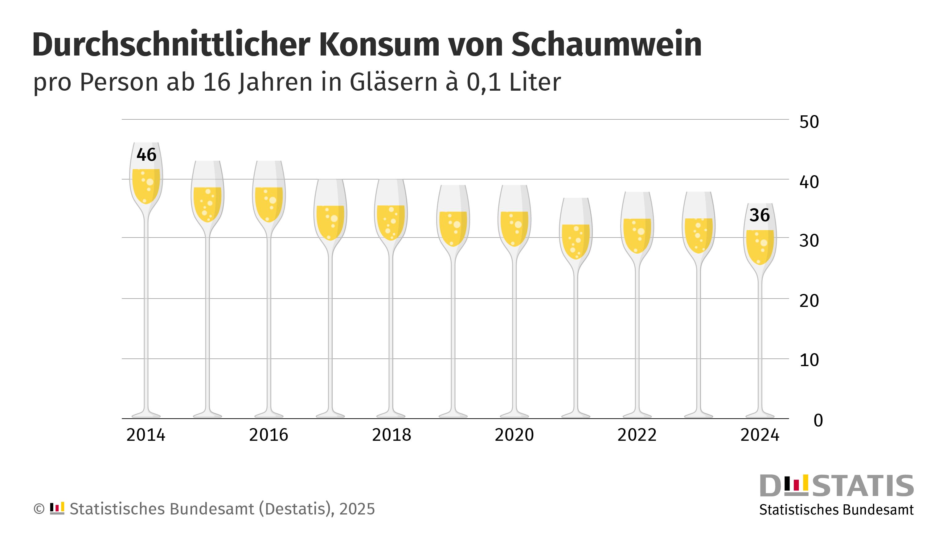 In Deutschland wurden im Jahr 2024 255,3 Mio. l Schaumwein abgesetzt. Das waren 19,5% weniger als zehn Jahre zuvor, teilt das Statistische Bundesamt (Destatis) mit. Im Durchschnitt habe damit im vergangenen Jahr jede Person ab 16 Jahren etwa 4,8 Flaschen Schaumwein (0,75 l) getrunken, was 36 Gläser (0,1 l) entspricht. 2014 waren es laut Destatis noch 6,1 Flaschen bzw. 46 Gläser Schaumwein gewesen. Diese Daten erhebt das Bundesamt auf Grundlage der Steuerstatistik. Auf Sekt, Prosecco, Champagner etc. wird die Schaumweinsteuer erhoben, die dem Staat im Jahr 2024 rund 352 Mio. Euro einbrachte. Damit hatte sie laut Mitteilung einen Anteil von 0,04% an den gesamten Steuereinnahmen des Bundes. Alkoholfreier Sekt ist in den Ergebnissen nicht enthalten, da die Schaumweinsteuer nur auf Schaumwein mit mehr als 1,2% vol Alkohol erhoben wird. Im Vergleich zum Vorjahr 2023 (267,2 Mio. l) beläuft sich das Minus auf 4,4%. Für die erste Hälfte 2025 liegen Zahlen des Verbands Deutscher Sektkellereien (VDS) vor: Die VDS-Mitglieder, die nach Verbandsangaben 95% der in Deutschland abgesetzten Menge repräsentieren, verkauften im ersten Halbjahr 1,6% weniger alkoholhaltigen Schaumwein als im Vorjahreszeitraum. -red-